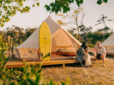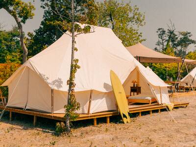 Dein Aufenthalt bei Yume Surfcamps Unser Surfcamp ist für maximal 40 Gäste ausgelegt und schafft eine intime und einladende Atmosphäre, in der du Erfahrungen teilen und Freundschaften mit Gleichgesinnten schließen kannst. Dein Aufenthalt wird zu einem Glamping-Erlebnis - du schläfst in wunderschönen Glockenzelten auf Holzplattformen, die Komfort und Natur miteinander verbinden. Jedes Zelt verfügt über ein gemütliches Bett, Strom und Beleuchtung.